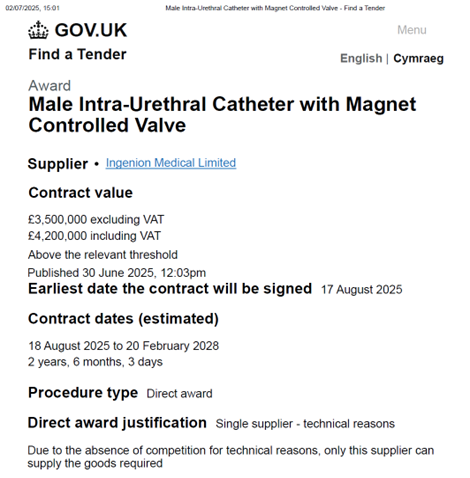 Simplified procurement: Trusts will be able to access Ingenion Medical's catheter solution through an established, compliant route without the need for individual tender processes, reducing administrative burden and accelerating time-to-patient.